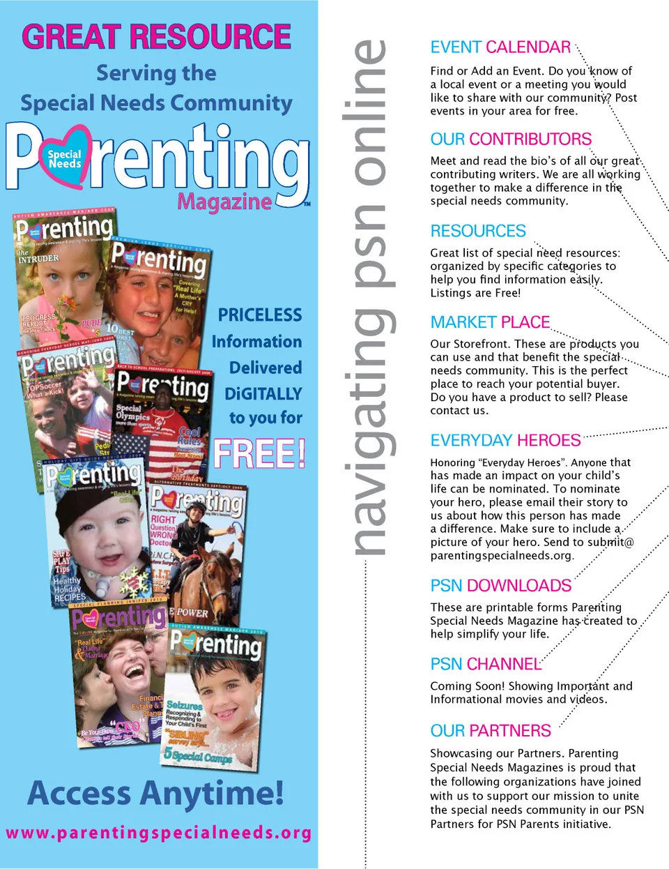 navigating psn online GREAT RESOURCE Serving the Special Needs Community EVENT CALENDAR Find or Add an Event. Do you know of a local event or a meeting you would like to share with our community? Post events in your area for free. OUR CONTRIBUTORS Meet and read the bio’s of all our great contributing writers. We are all working together to make a difference in the special needs community. Magazine RESOURCES Great list of special need resources: organized by specific categories to help you find information easily. Listings are Free! PRICELESS Information Delivered DiGITALLY to you for MARKET PLACE Our Storefront. These are products you can use and that benefit the special needs community. This is the perfect place to reach your potential buyer. Do you have a product to sell? Please contact us. FREE! EVERYDAY HEROES Honoring “Everyday Heroes”. Anyone that has made an impact on your child’s life can be nominated. To nominate your hero, please email their story to us about how this person has made a difference. Make sure to include a picture of your hero. Send to submit@ parentingspecialneeds.org . PSN DOWNLOADS These are printable forms Parenting Special Needs Magazine has created to help simplify your life. PSN CHANNEL Coming Soon! Showing Important and Informational movies and videos. OUR PARTNERS Access Anytime! www.parentingsp ecialneeds.org Showcasing our Partners. Parenting Special Needs Magazines is proud that the following organizations have joined with us to support our mission to unite the special needs community in our PSN Partners for PSN Parents initiative.